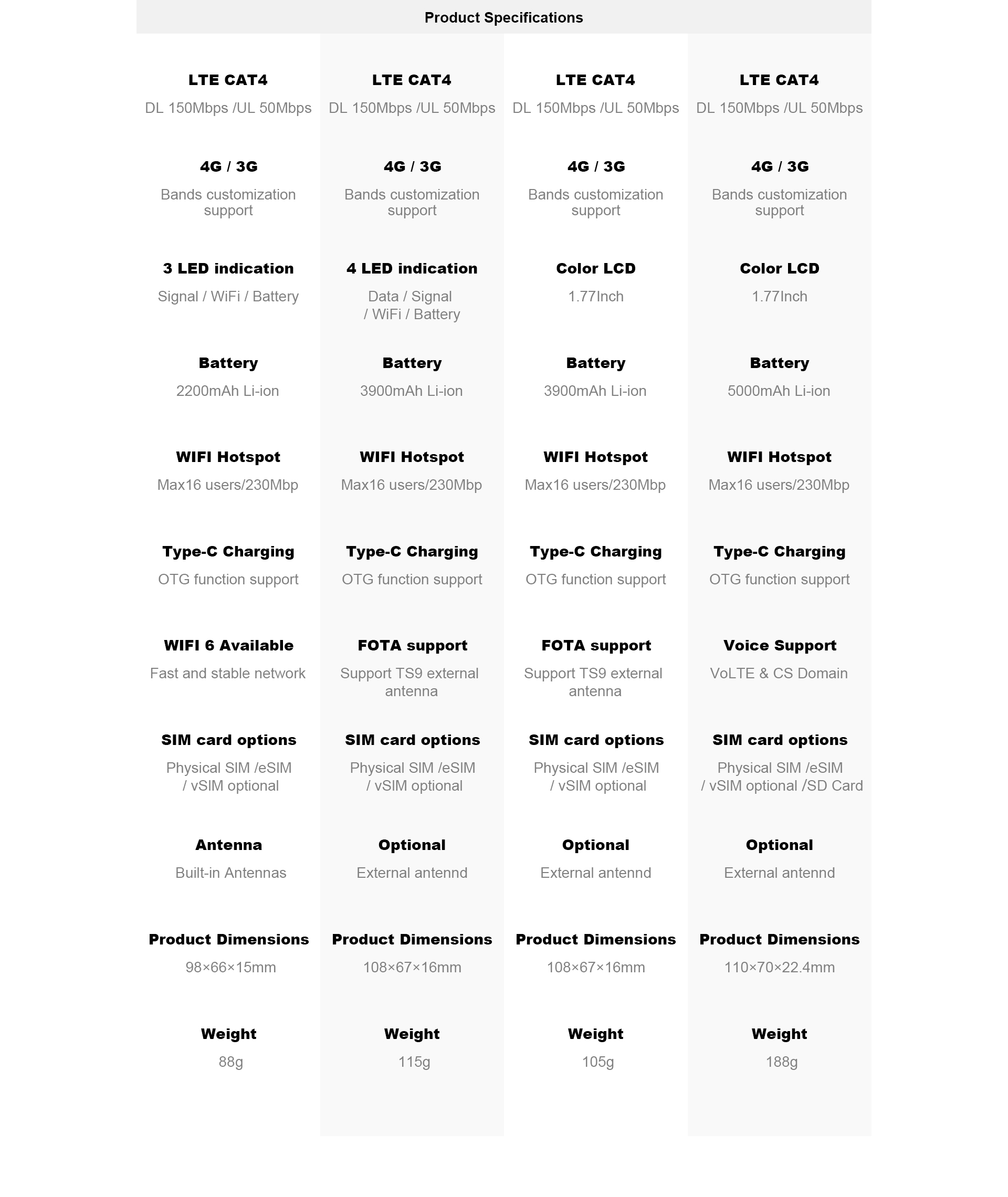 | LED Indication | Singal, Battery, SMS, WIFI |